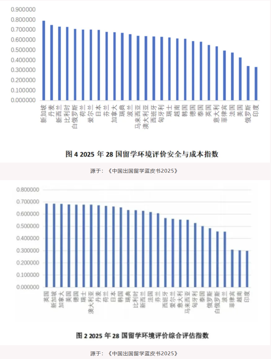 安全性和成本是学生和家长在选择留学目的地时的重要考量因素。根据蓝皮书的“安全与成本指标体系”,新加坡在全球范围内位列第一,综合得分超过0.7;在“综合评估指数”中,新加坡位列第二,综合得分超过0.6。这表明新加坡是一个兼具安全性高、性价比优、生活便利的留学目的地。